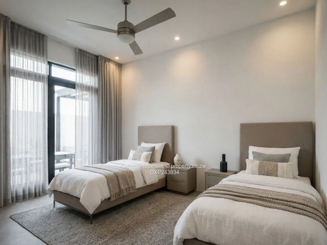 Prime 600 m² residential stand for sale in coveted Borrowdale, Harare North — a rare opportunity to build your dream home in a secure, well-serviced neighbourhood. The lot benefits from access control, tarred roads, a municipal sewer system and reliable municipal water connections. The images provided illustrate a contemporary single-storey design concept perfectly suited to this stand: a light-filled open-plan living area with tasteful neutral finishes, ceiling fan and sliding glass doors that flow to a private courtyard; a modern kitchen island with breakfast bar; a spacious dining area for entertaining; a serene twin-bed guest or children’s bedroom; and a shaded pergola patio framed by greenery for alfresco lounging. With easy access to schools, shopping and main arteries of Harare, this stand is ideal for a family home or an investor wanting a high-demand Borrowdale address. Contact us to arrange a viewing or to discuss approved plans and developer recommendations.